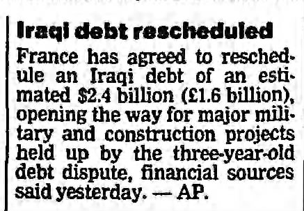 💥💥💥💥💥💥💥💥💥💥💥💥💥 وفي وقت كانت لعبة التداخلات المصرفية لعصابة ال BCCI الخليجية تتلاعب بالتعاون مع مصارف دولية اخرى واجهزة مخابراتية مرتبطة بالشبكة العملاقة لصنع الفشل الاقتصادي داخل العراق كانت فرنسا تعيد برمجة الديون امل بالحصول على مشاريع جديدة في العراق وقبلت اليابان