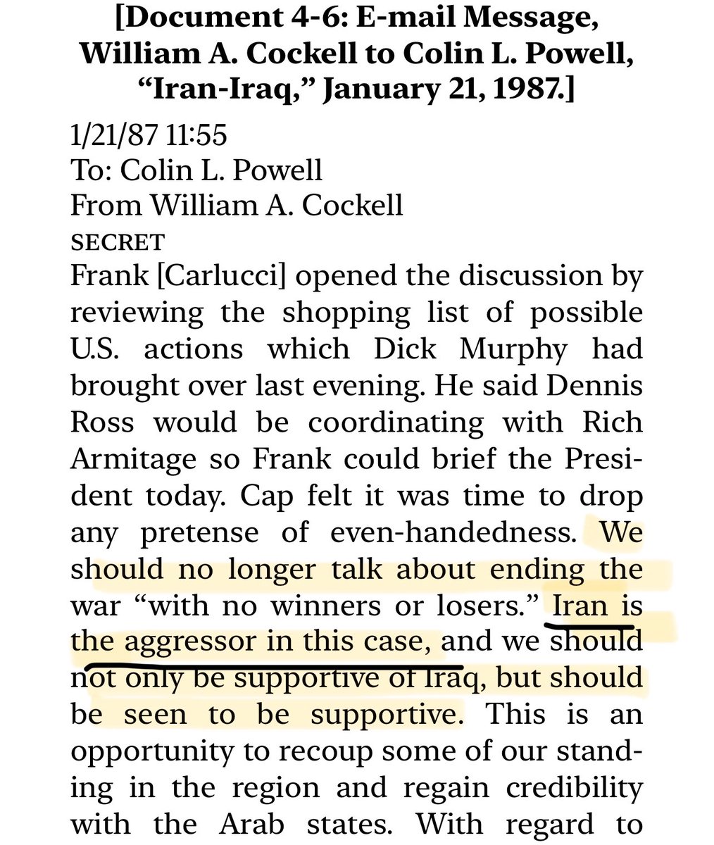 وثيقة سرية 21.01.1987 كولن باول يستلم ادارة الامن القومي بعد فضيحة ايران كونترا تبين هذه الوثيقة ان هناك مفهوم عام بأن ايران هي المعتدية في تلك الحرب في حقيقة الامر. يحث باول ادارته قائلا: "انه لا يجوز الحديث عن هذه الحرب على انها يجب ان تكون صراع بلا فائز او خاسر . ايران هي