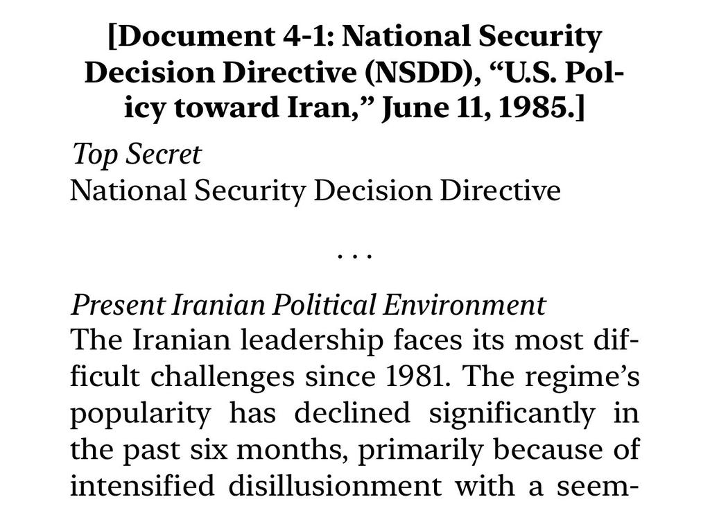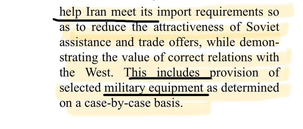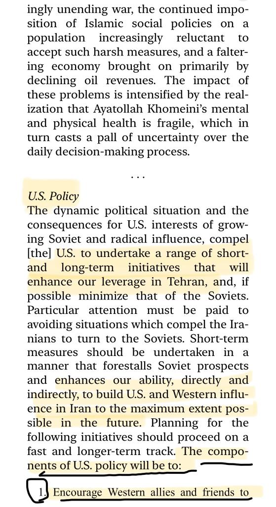 💥💥💥💥💥💥💥💥💥💥💥💥💥 11.06.1985 اثناء حرب ايران تنص التوصية الامريكية وتحت غطاء "التنافس مع السوفييت" على قرار من ادارة الامن القومي الأمريكي وهي اعلى جهة امنية بدعم ايران بما تحتاجه ومن ضمنها الدعم العسكري، وكذلك تشجيع حلفاء الولايات المتحده وحثهم على تقديم الدعم لايران.