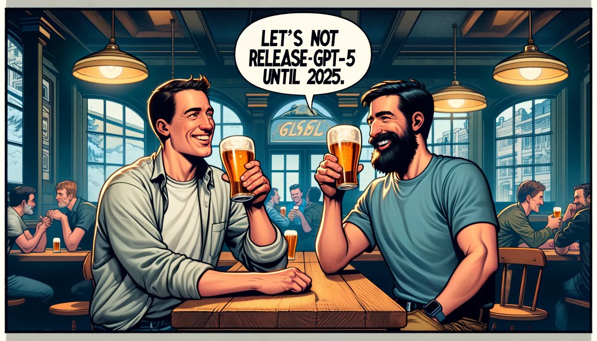 @random_walker Right now in @OpenAI after testing Gemini Ultra “Let’s not release GPT-5 until 2025” 🍻