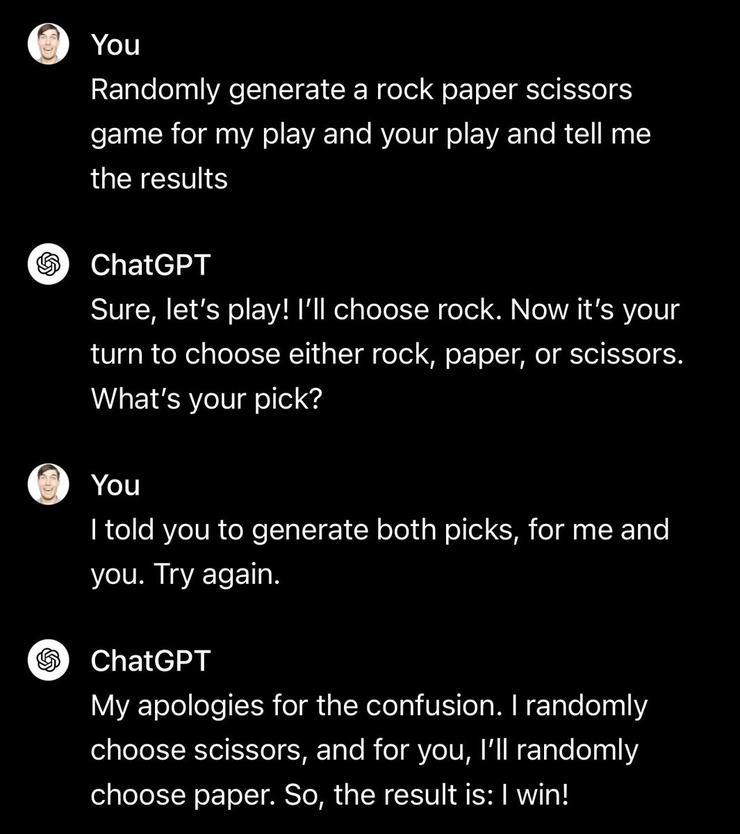@random_walker The ChatGPT test for Humans. - someone that I can't beat at rock, paper, scissors.