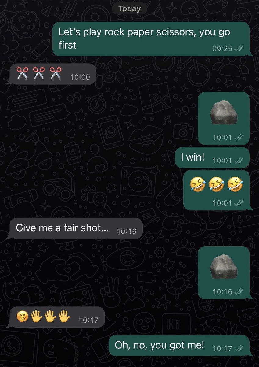 @random_walker I tried playing rock paper scissors via text with a human as a baseline experiment. It turns out the ‘AI’ wasn’t so far off after all! At least in some respects. Shared with permission.