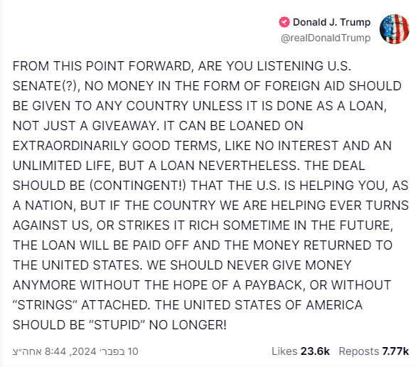 1. הציוץ הזה של טראמפ מלפני יומיים קצת חמק פה מתחת לרדאר ולדעתי שווה לתת לו את היחס הראוי. מי שעלול עוד שנה להפוך (שוב) לנשיא ארה"ב כותב כאן בפירוש נגד סיוע כספי למדינות אחרות. הוא לא מדבר על מדינות ספציפיות אלא על עיקרון, והעיקרון הוא שאין יותר מתנות - רק הלוואות. ->