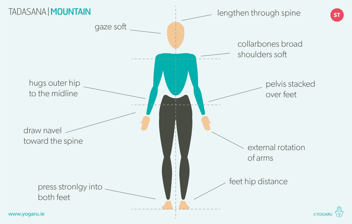 Go into Tadasana or mountain pose. Use this picture to guide you. Stay in this position for 10-20 minutes, bringing your awareness inside, and maintaining a soft and light breathing pattern. A few things will happen...