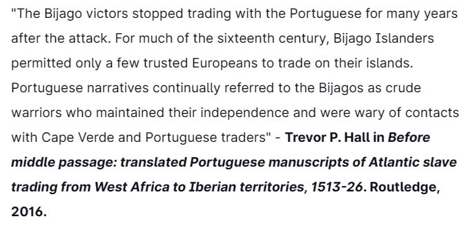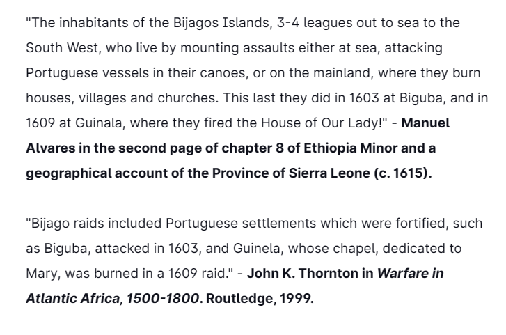 Henceforth, the Bijagos made life uncomfortable for the Portuguese in the area, causing them in 1607 to seek the assistance of the spanish potentate to fight the Bijagos. Still, in 1609 the Portuguese settlement in Guinela was greeted with a Bijago raid & their chapel was burnt.