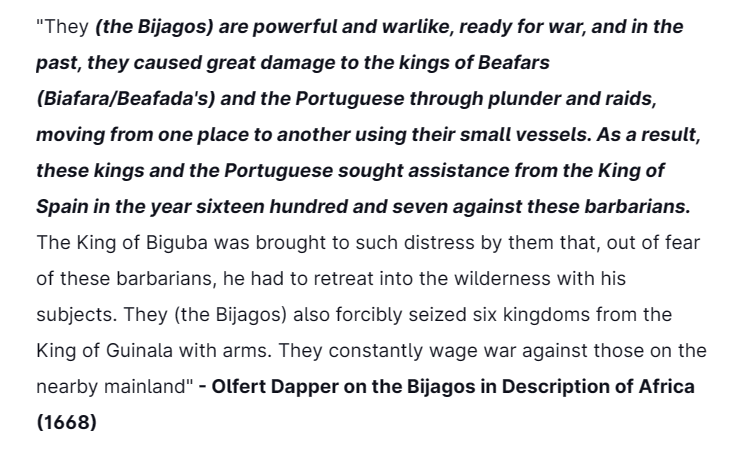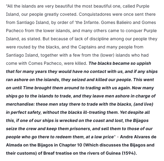 However, the Bijagos, confident in their military superiority on their turf, turned a deaf ear to such demands, & were waiting for them to come & die. So in 1535, conquistadors were sent against them, but they were beaten, broken, scattered & slaughtered with few survivors.