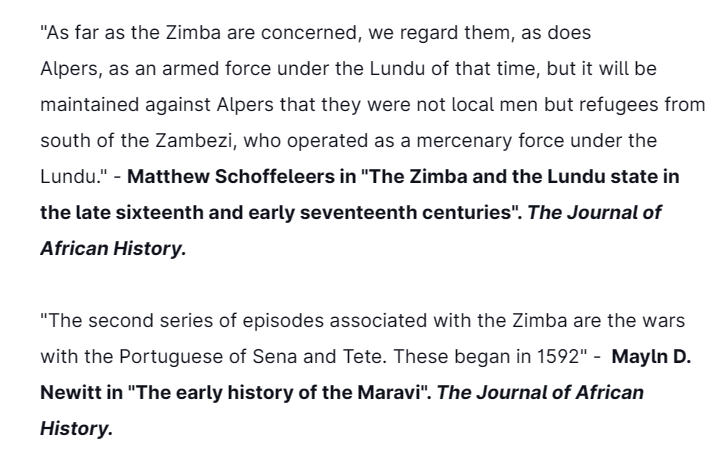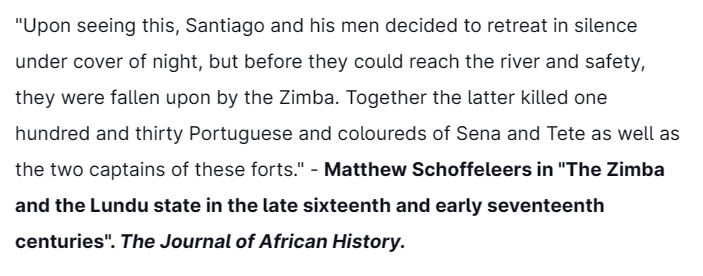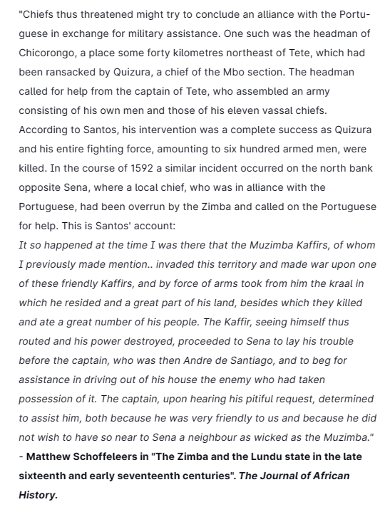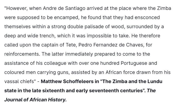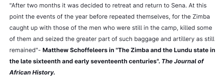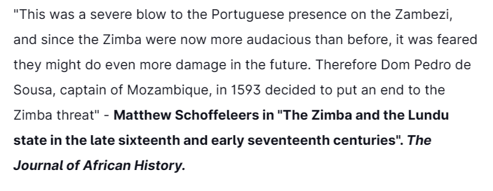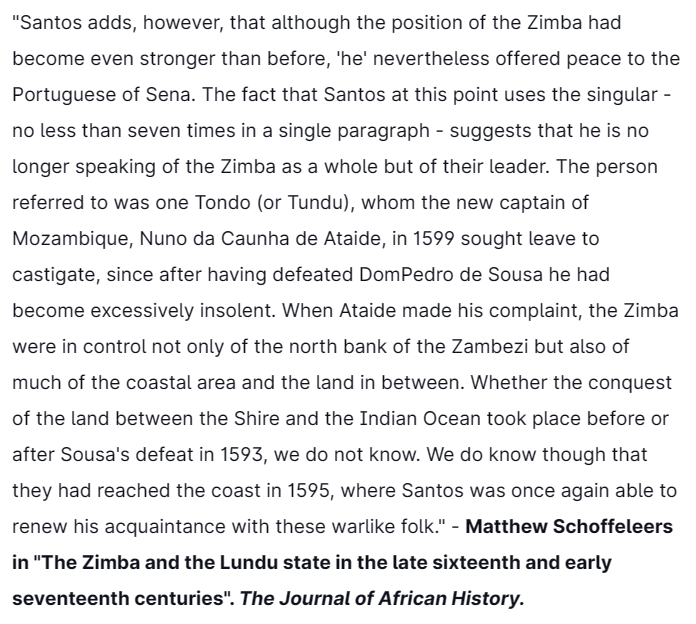 Three years after helping the Portuguese crush the Ottomans & smoke them out of Mombasa at the 1589 battle of Mombasa, the special military unit of the Lundu Maravi people, "the Zimba", would clash with Portuguese forces on different occasions.