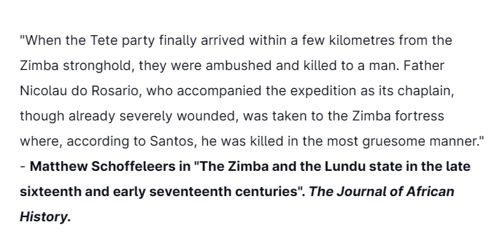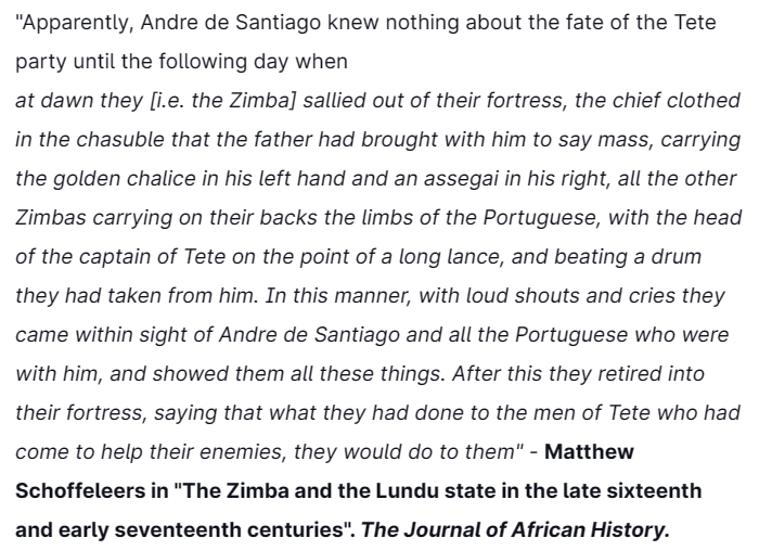 The next day, the Zimbas showed the decapitated head of de Chaves & the limbs of the slain Portuguese men to Andre de Santiago, the armed commander of the Portuguese community in Sena. The Zimbas promised him & his men the same fate.
