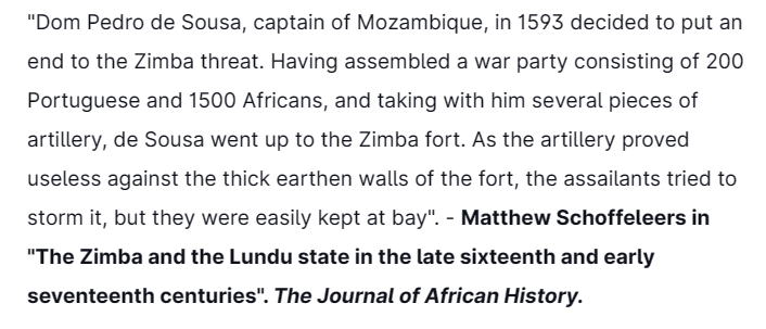 This was a severe blow to the Portuguese presence in the Zambezi, & in 1593 Dom Pedro de Sousa, commander of the Portuguese in Mozambique decided to put an end to the Zimba who were dreaded.