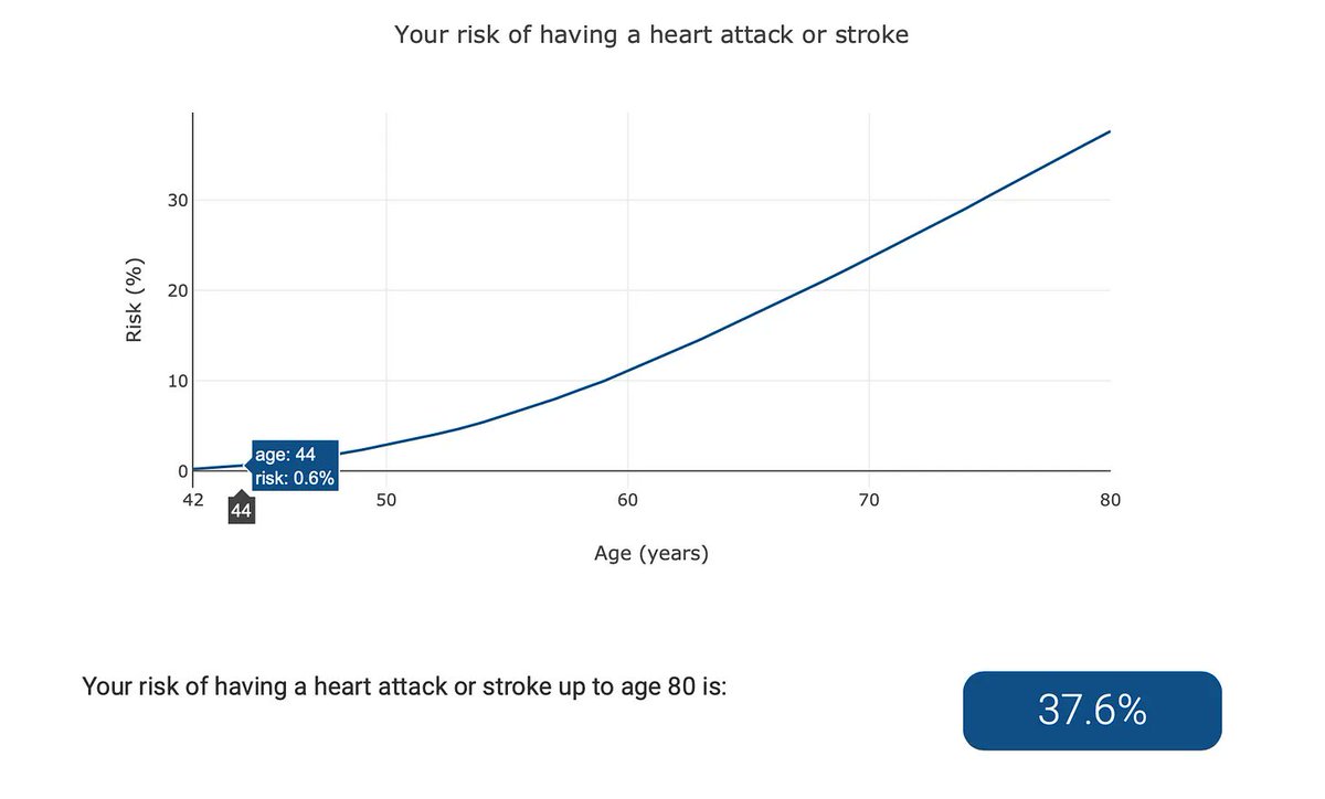 Letās take a 42-year-old male Who is a little overweight BMI 26.1 Has a systolic blood pressure of 130mmHg LDL-C of 4 mmol/L (155 mg/dl) And a family history of heart attack. This is what their risk of a heart attack out to age 80 looks like. /15