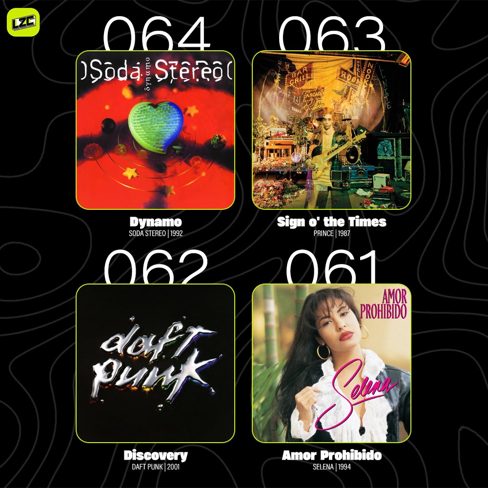 64. Dynamo - Soda Stereo (1992) 63. Sign O' The Times - Prince (1987) 62. Discovery - Daft Punk (2001) 61. Amor Prohibido - Selena (1994)