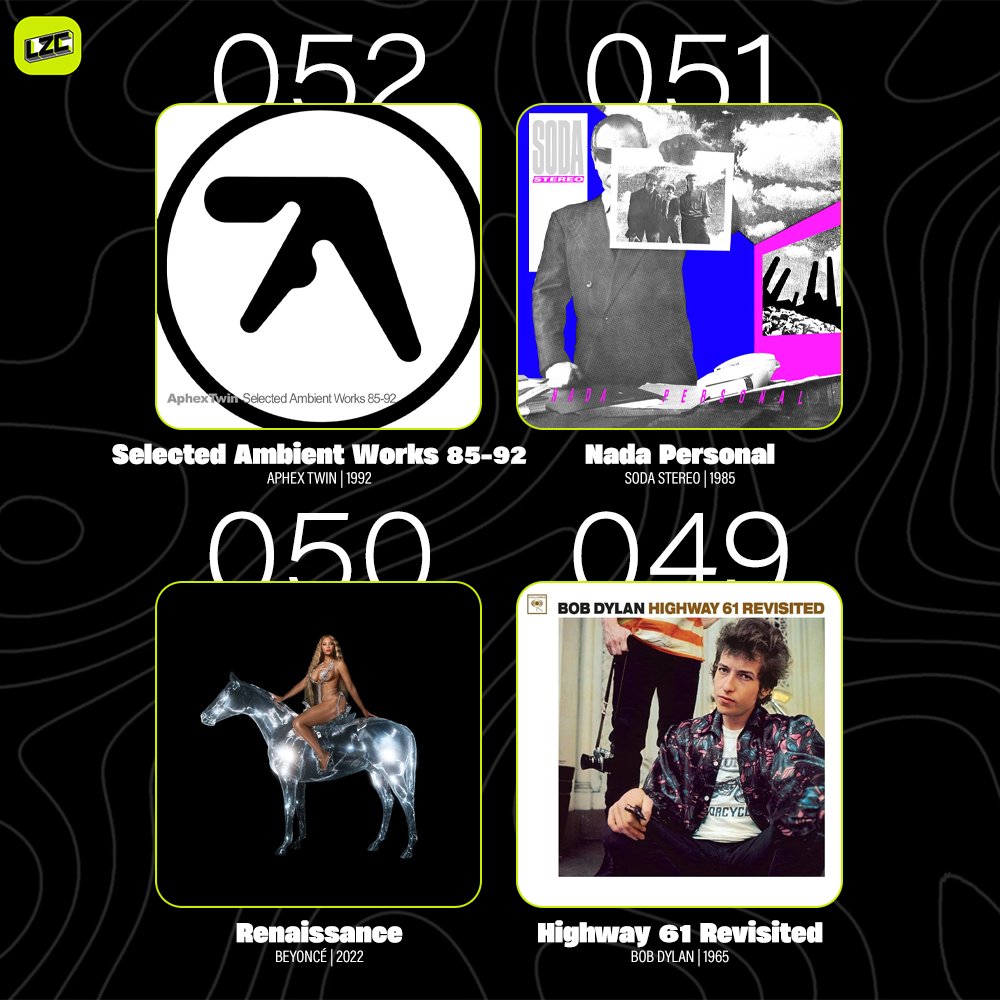 52. Selected Ambient Works 85-92 - Aphex Twin (1992) 51. Nada Personal - Soda Stereo (1985) 50. Renaissance - Beyoncé (2022) 49. Highway 61 Revisited - Bob Dylan (1965)