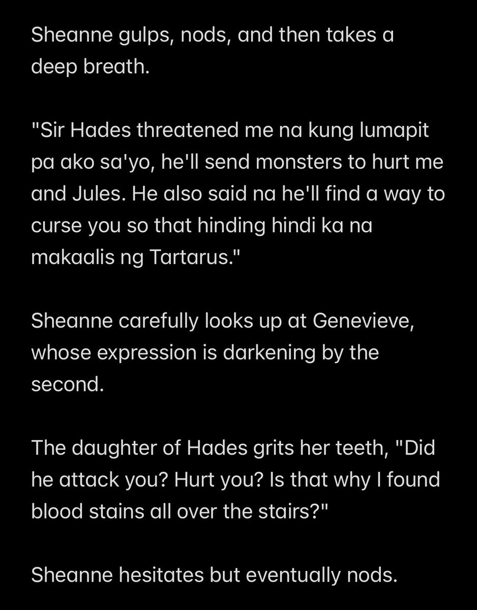 - End of Chapter 11 - Disclaimer: The story is not completely accurate sa PJO/HOO so if ever may inconsistencies and inaccuracies, there's that. Also excuse any typo/grammar/naming mistakes! Thoughts and prayers: https://curiouscat.live/bebeca...