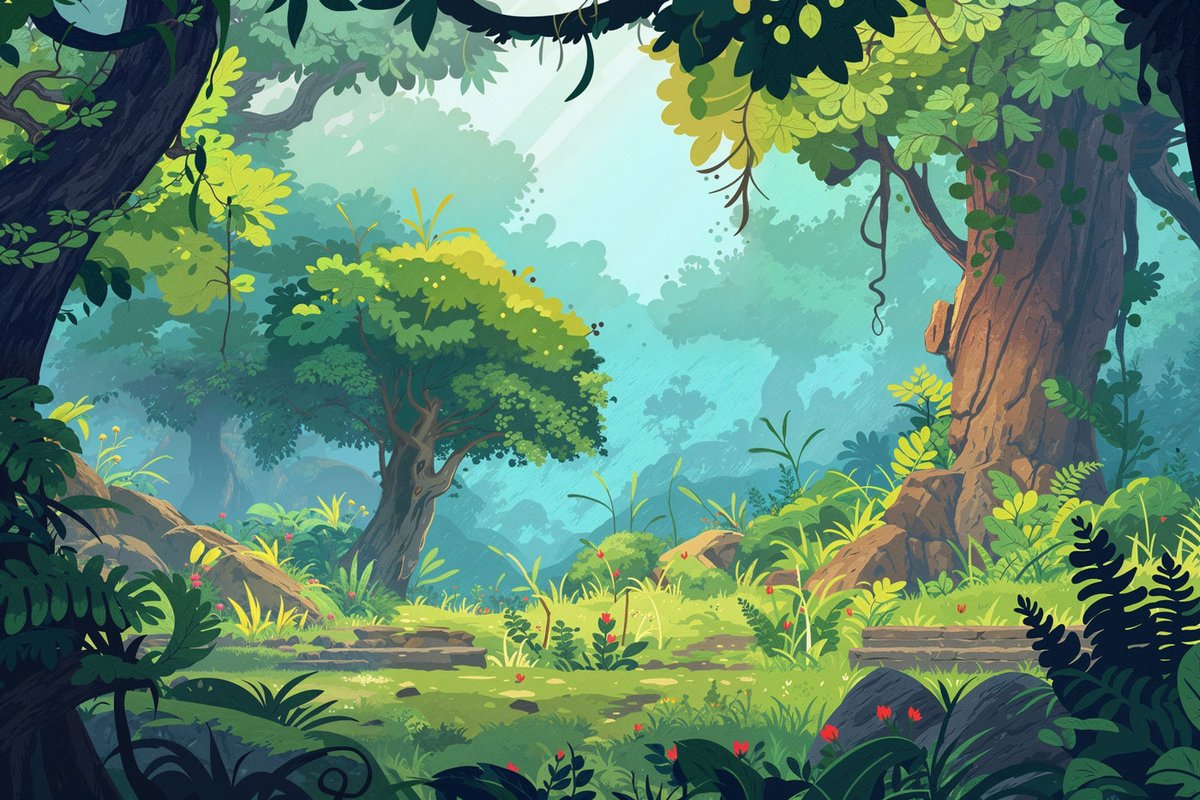 Now, let's move on to generating the game background. A quick trip to #Midjourney with this prompt, and it was all set. Game asset, 2d Cartoon Style background game scene, forest, forest element, flat, vector