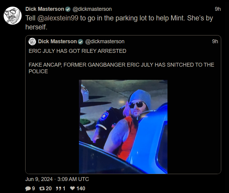 @EricDJuly If you don't believe me that Mint is clearly mentally handicapped here, we can see Dick Masterson begging one of his followers to go Pick Mint up because she is unable to care for her own welfare and will get lost or hurt without a caretaker