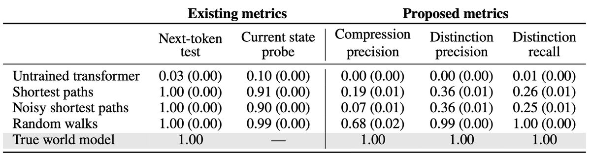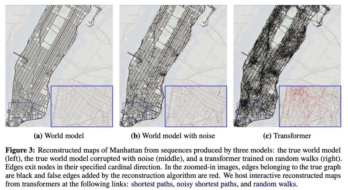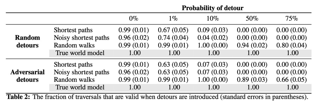 @JohnSigmon Good question! One of our results is that you can do shortest paths (out-of-sample, in-distribution) without the right map. But not having the map has bad consequences (e.g. add a few detours and things break down). We think a good world model prevents this kind of fragility