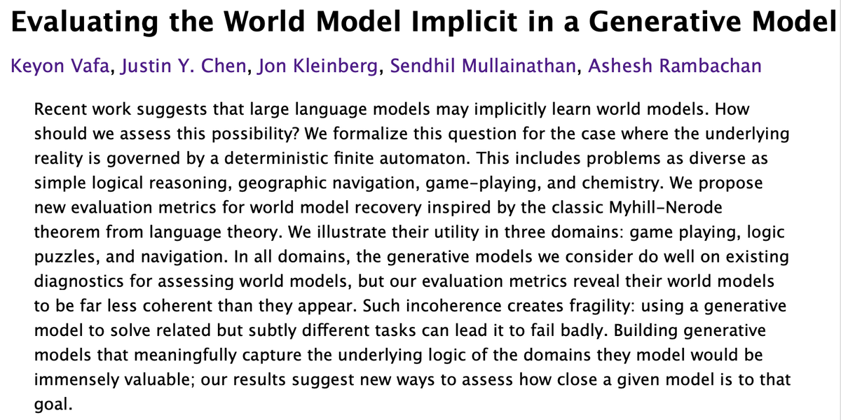 Paper: https://arxiv.org/abs/2406.036... Code: https://github.com/keyonvafa/w... Co-authors: Justin Chen (@justinychen), Jon Kleinberg, Sendhil Mullainathan (@m_sendhil), Ashesh Rambachan (@asheshrambachan)