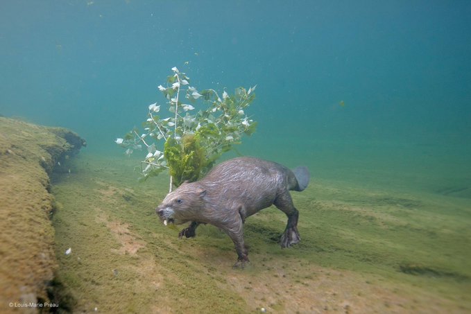 9. El fotógrafo Louis-Marie Preau se sumergió durante cuatro años -noche tras noche, con equipo de buceo y pesas- para fotografiar a un castor entregando una rama a su familia en el río Loira.