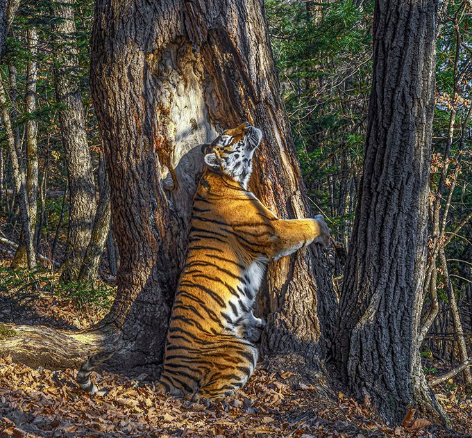 14. El fotógrafo Sergey Gorshkov tardó 11 meses en capturar su premiada imagen de un tigre siberiano abrazado a un antiguo abeto de Manchuria, en el este de Rusia.