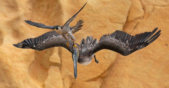 19. Jack Zhi tardó cuatro años en captar la rara imagen de un halcón hembra atacando a un gran pelícano pardo.