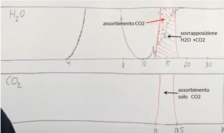 2)La CO2 assorbe radiazioni infrarosse intorno ai 15micron (13-17) Ma a quella frequenza è in sovrapposizione con il vapore acqueo. La CO2 ne assorbe solo un 30% in quella zona. Il resto è opera del vapore acqueo. 3/12