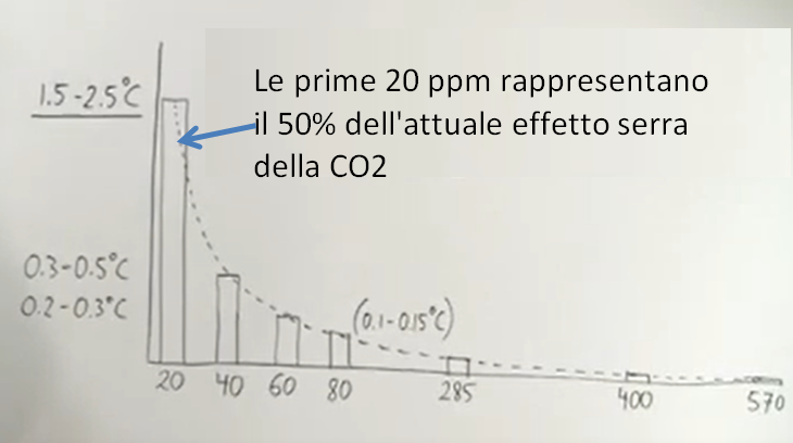 3) Le prime 20 ppm di CO2 costituiscono il 50% di tutto l’effetto serra della CO2. Le successive 20ppm dimezzano progressivamente l’effetto. Questo significa che l’incremento della T dovuto agli attuali valori di 420 ppm è quasi trascurabile. 4/12