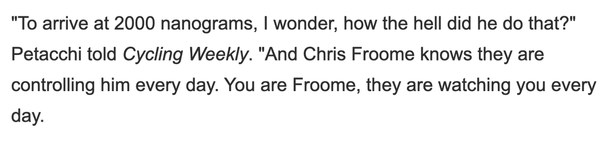 9/x In July 2018, days before the start of the Tour de France, the UCI announced that they were dropping the case against Froome, citing the “significant number of expert and scientific reports" put forward by Froome's legal team as the principal reason. https://www.cyclingweekly.com/...