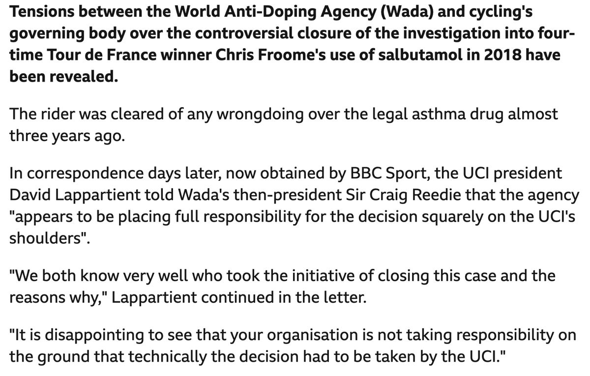 12/x It was revealed in 2021 that the UCI and WADA blamed each other for Froome’s acquittal. The UCI claimed it closed the case based on “WADA’s position”. WADA countered that it was “disappointing” and “wrong” that the UCI should claim that its hands were tied by WADA.