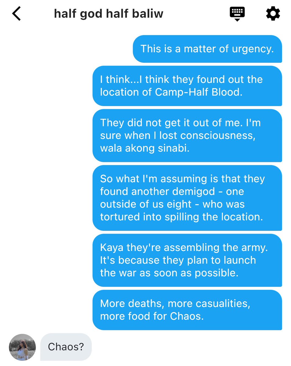 - End of Chapter 16 - Disclaimer: The story is not completely accurate sa PJO/HOO so if ever may inconsistencies and inaccuracies, there's that. Also excuse any typo/grammar/naming mistakes! https://curiouscat.live/bebeca...