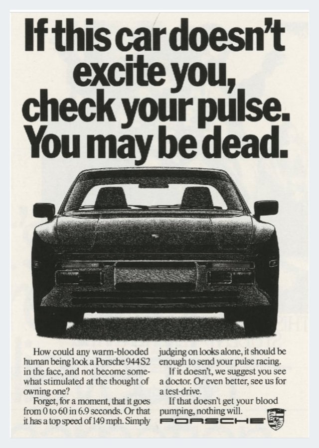 14. Porsche 944S2 Principle: Hypnotic Identity Bias If you don't think this car is exciting -- you must be dead. Therefore if you're not dead, you must think it's exciting. The most hypnotic ad copy ever.