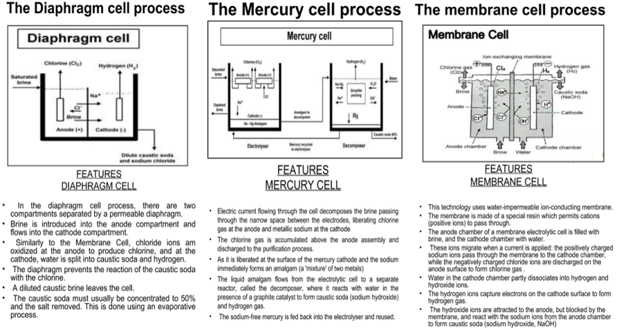 It is primarily produced through the electrolysis of sodium chloride (NaCl) solution in a process known as the chlor-alkali process 3 main types of processes used a) Mercury Cell Process b) Diaphragm Cell Process c) Membrane Cell Process (3/n)