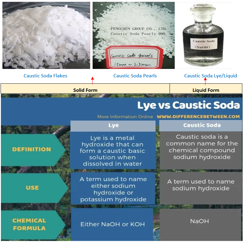 Basic difference between Lye and Caustic Soda: Lye can refer to either sodium hydroxide (NaOH) or potassium hydroxide (KOH),while caustic soda refers to sodium hydroxide (NaOH) (5/n)