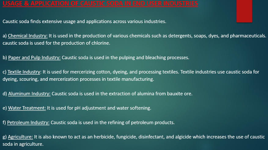 Caustic soda finds usage & applications across various industries a) Chemical Industry b) Paper and Pulp Industry c) Textile Industry d) Aluminum Industry e) Water Treatment f) Petroleum Industry (9/n)