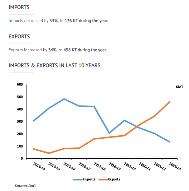 India's caustic soda capacity was 55.65 lakh TPA, with production at 44.73 lakh TPA as on FY23 (having 80% capacity utilization rate) India has been a net exporter since FY20 (11/n)