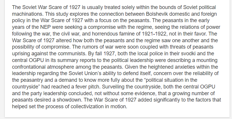 The 1927 Anglo-Soviet war scare also played an important role. Faced with rumours of war, peasants stocked up on grain, leading to a food crisis in the cities. No coincidence that collectivization began soon after https://www.researchgate.net/p...