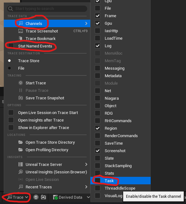 If you're in the editor, you can click the little "Trace" button in the lower right corner and turn on the "Task" channel. Optionally you can also turn on "Stat Named Events" which enables telemetry for more functions, which I always turn on myself when profiling. 🧵