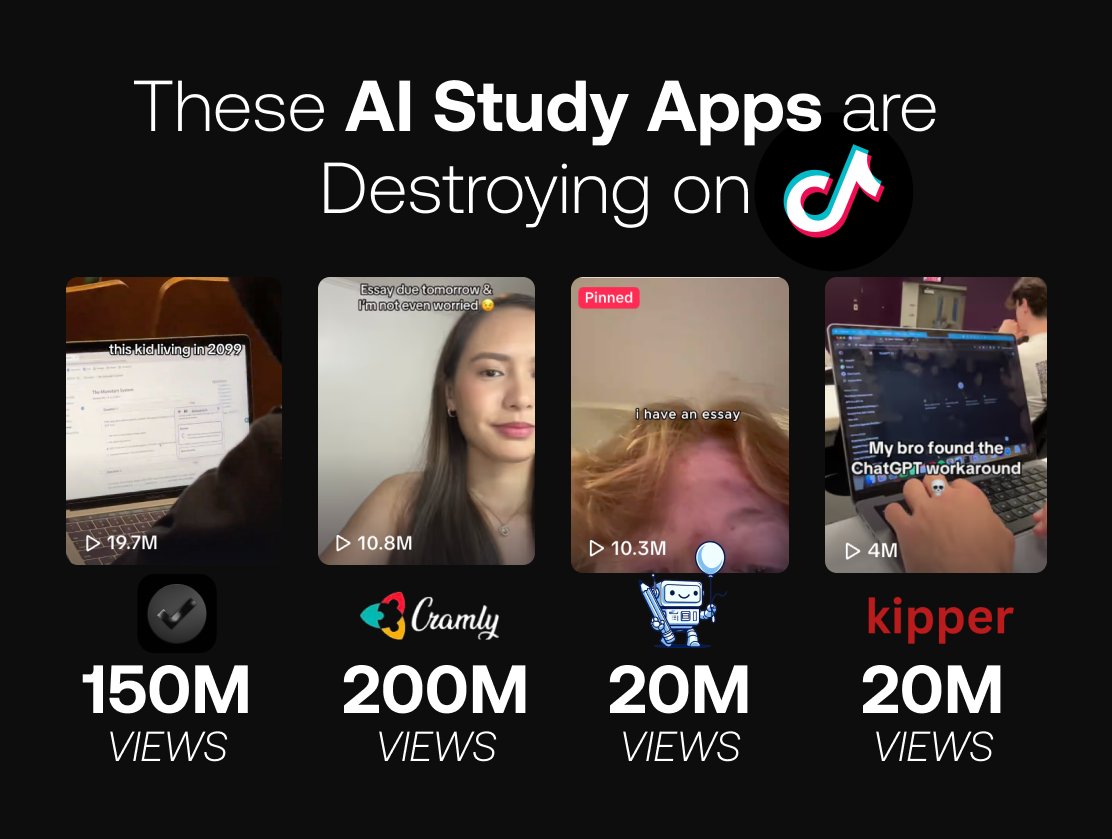 For every AI study tool performing well on TikTok, there are 10 more struggling that could be doing great. A few of them: tt@unriddle_ai tt@stealthwriter.ai tt@writeless.ai tt@tasksheet_ai tt@simplified.ai Itâs an extremely competitive space, with players building OpenAI