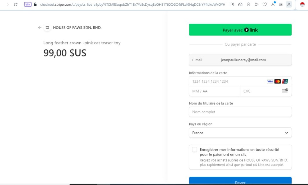 Quand j'achète (fausse CB) je suis redirigé vers cette URL une première fois. Au bout de quelques secondes, cela me redirige vers Stripe (à droite) au nom d'une boutique qui n'a rien à voir. Si je clique sur le bouton retour en arrière, j'arrive sur l'accueil du site de gauche.
