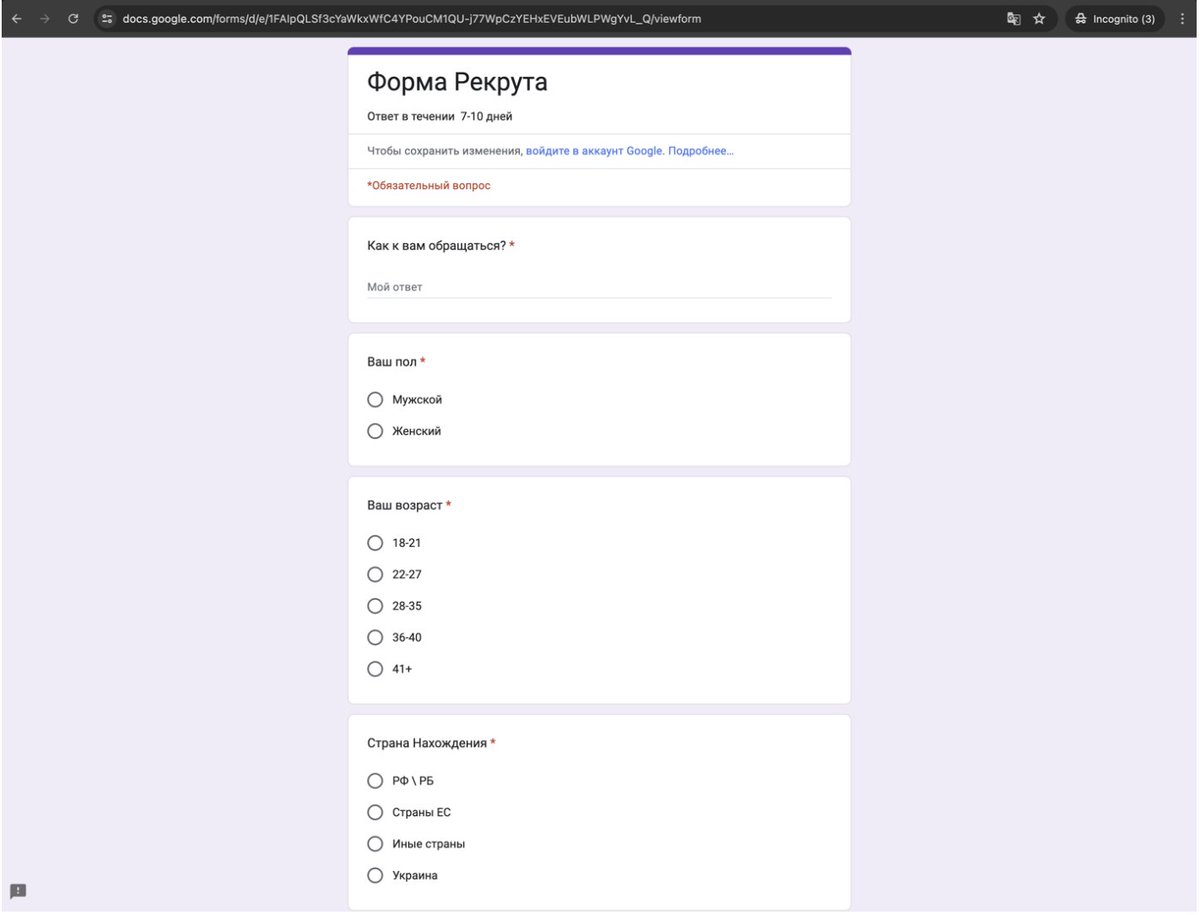 Второй же ФСБшный сайт, являющийся клоном сайта РДК, также имеет несколько вариантов связи. Подобно предыдущему ханипоту, он включает в себя онлайн-форму, в которой пользователям предлагается ввести свои персональные данные. Однако, в отличие от предыдущего ханипота, этот использует Google Forms для онлайн-формы идентичной оригинальной.