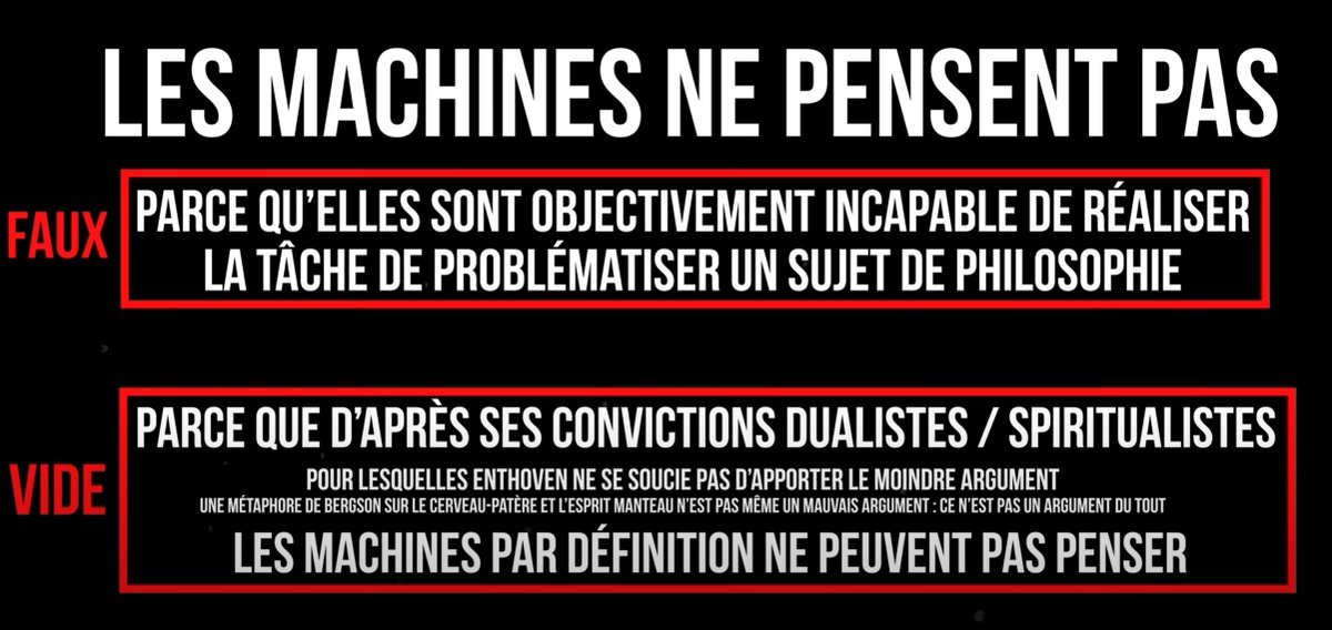 Et contrairement à vous qui faites des prophéties, je fais des expériences pour tester ce que j'affirme. C'est le sens du "test de Turing philosophique" que je présente dans la vidéo de 29:03 à 48:15. Je demandais à des participants (notamment des profs de philo) de détecter