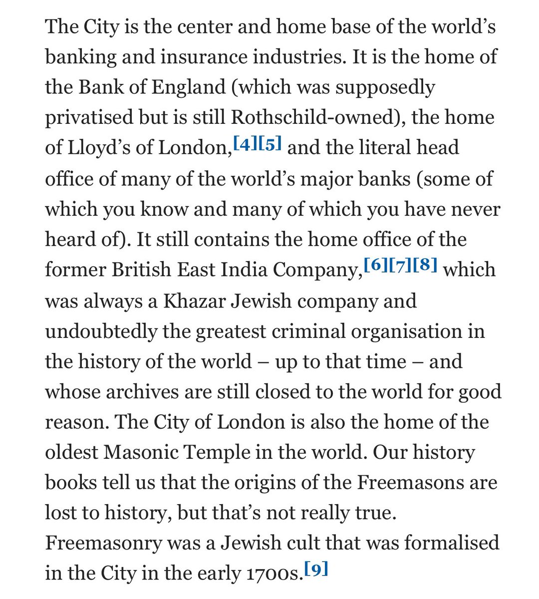 🚨✡️The City is so sovereign that the King of England himself is forbidden by both UK and City law to even enter the City of London without first obtaining a “special invitation”, which process is too complicated to bother discussing. The invitation ceremony is not required by