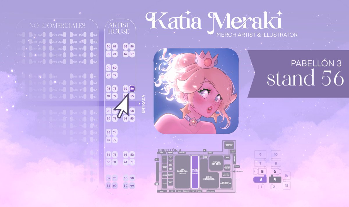 @JW_Arte Holi! ✨ Soy Diana y estaré en el pabellón 4, stand NC 122 (al fondito a la izquierda). Os espero con pegatinas, llaveros y totebags de michis 💖🐈⬛ y más cosas cuquis!