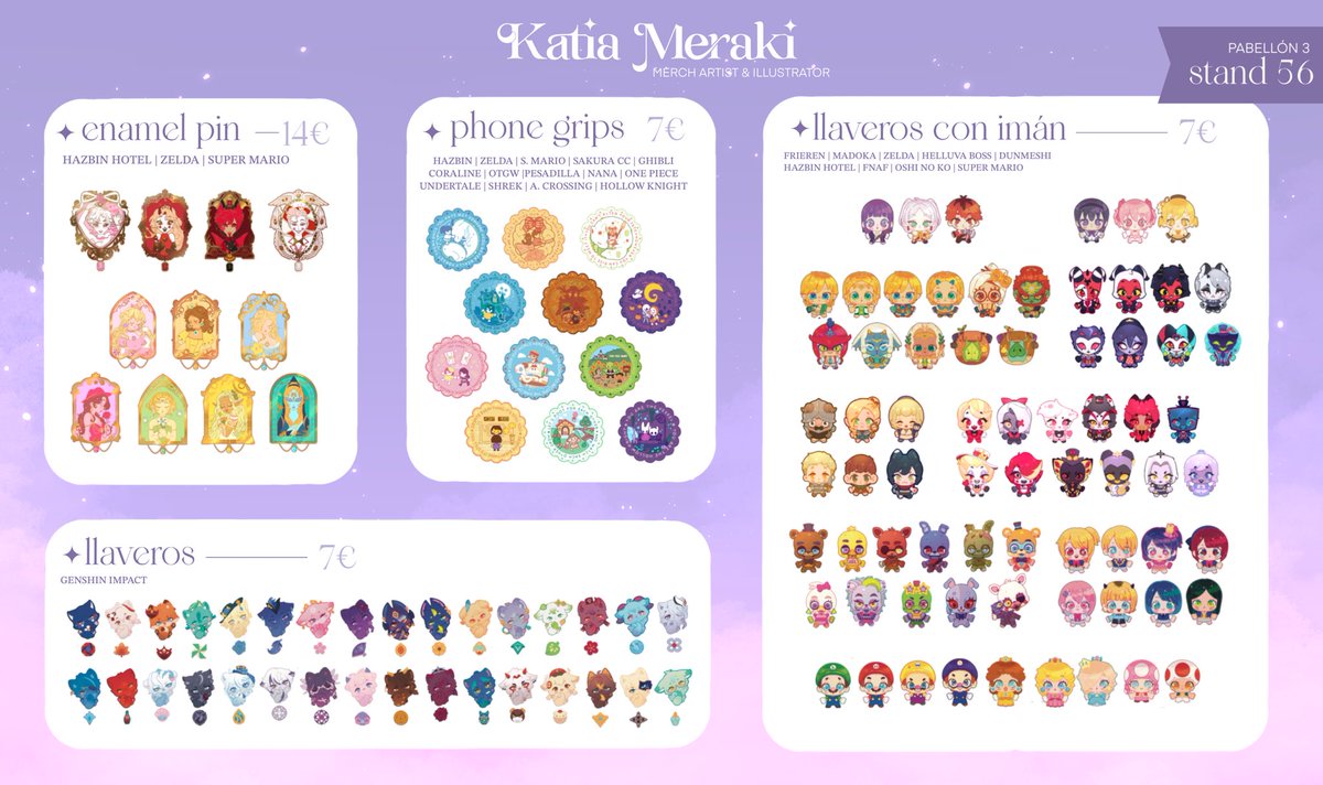 @JW_Arte Holi!! Soy Katia y podéis pasaros a verme en el stand 56 del pabellón 3! Traeré novedades como llaveros, gorras y pines de enamel de Hazbin/ Helluva y bolsos/ camisetas de Zelda! 🫶✨