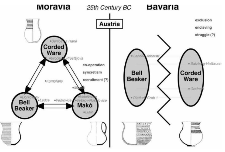 where the style gets adopted by the Native Indo-europeans. These early IE group distinguish themselves from their Corded Ware neighbours, with Beaker East Group sites being typicalls south of the Danube, and Corded ware sites North of it. In Moravia, there was more Cohabitation