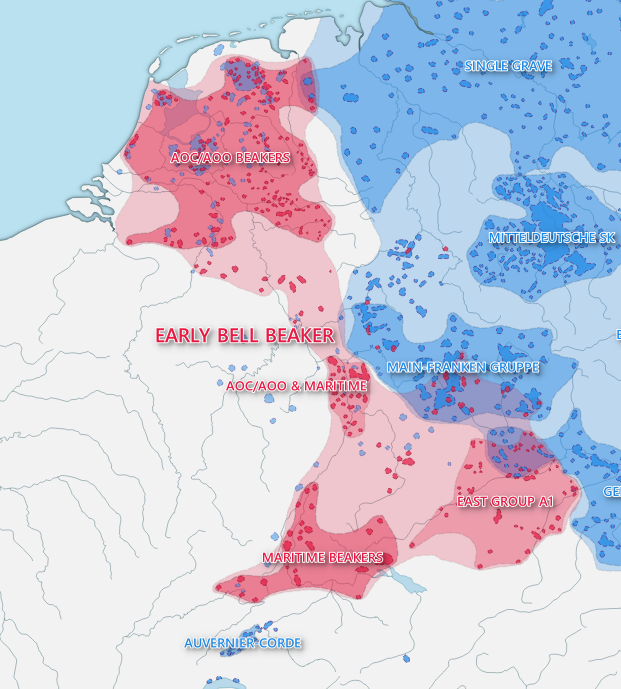In the North, in the netherlands, the picture is different. The IE Single-Grave culture developes their own Beakers, independent of Iberians. These styles are called AOO (All over ornamented) and AOC (All over corded) Beakers. Maritime beakers reach here and influence late...