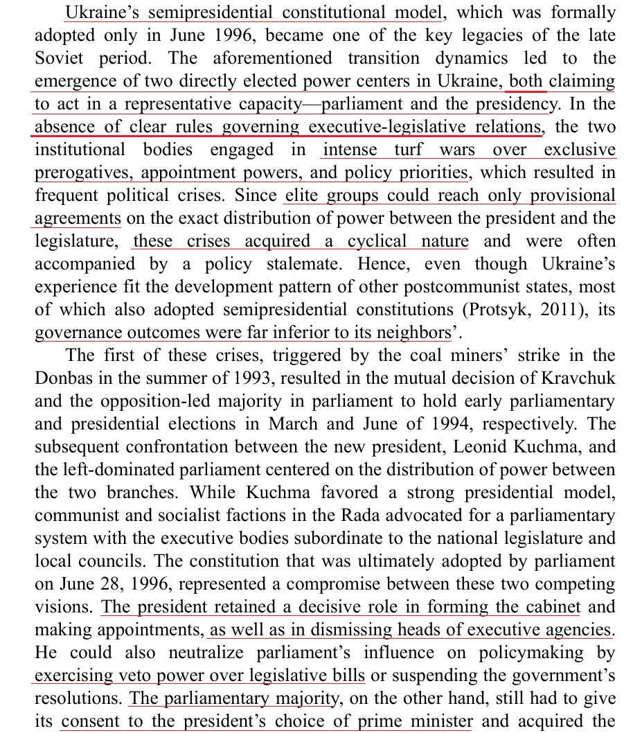 Ukraine faced an identical deep flaw of its democratic constitution as 90s Russia: President & Parliament were elected separately, had overlapping powers, with no legal method of overriding or reconciling their disagreements. Informal 'clan' networks ended up deciding policy.