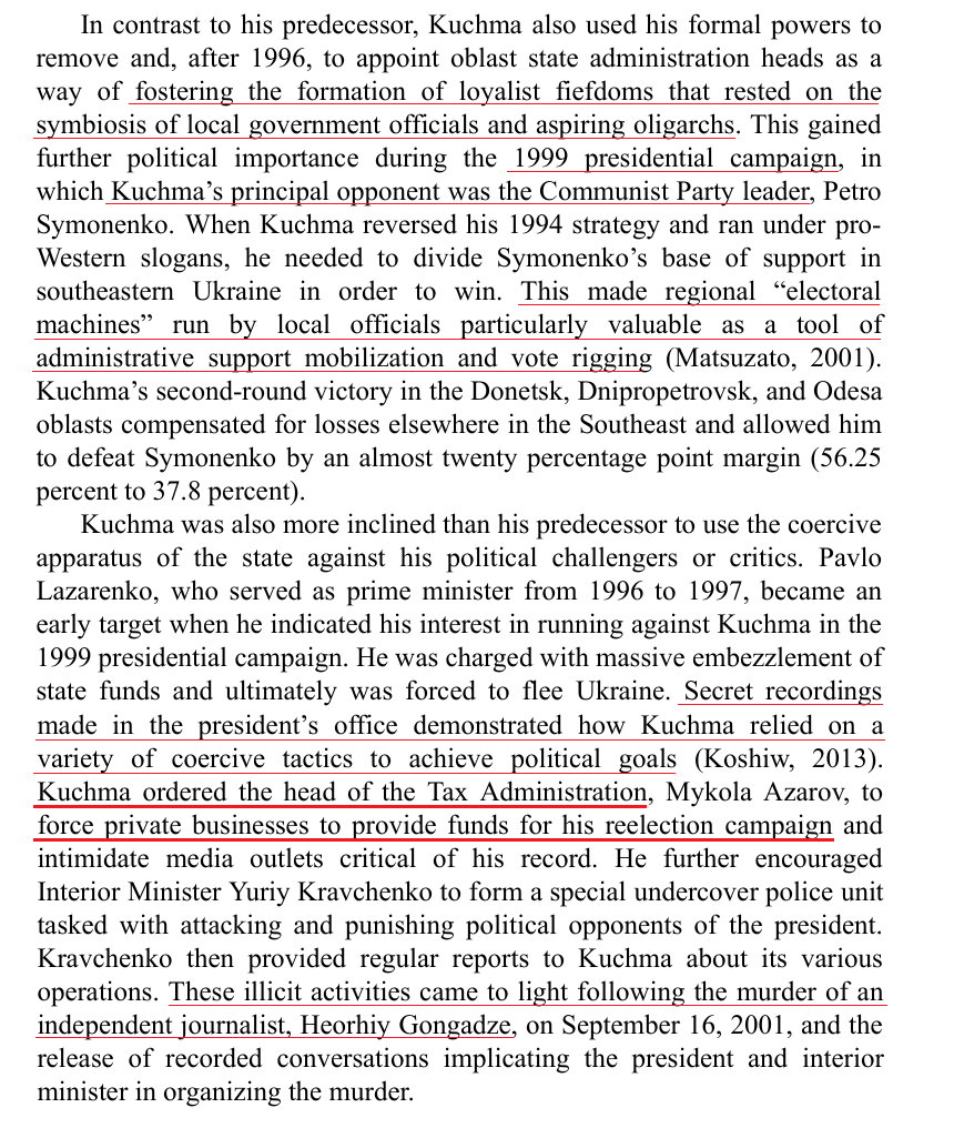 Kuchma's strategic corruption. Tax-office bullied businesses to give to his warchest. Lucrative energy-sector posts went to vainglorious pals like Medvechuk, who founded empty "parties" with Western names to run parliament. Vote-fraud needed to beat Communists. Slavic Democracy.