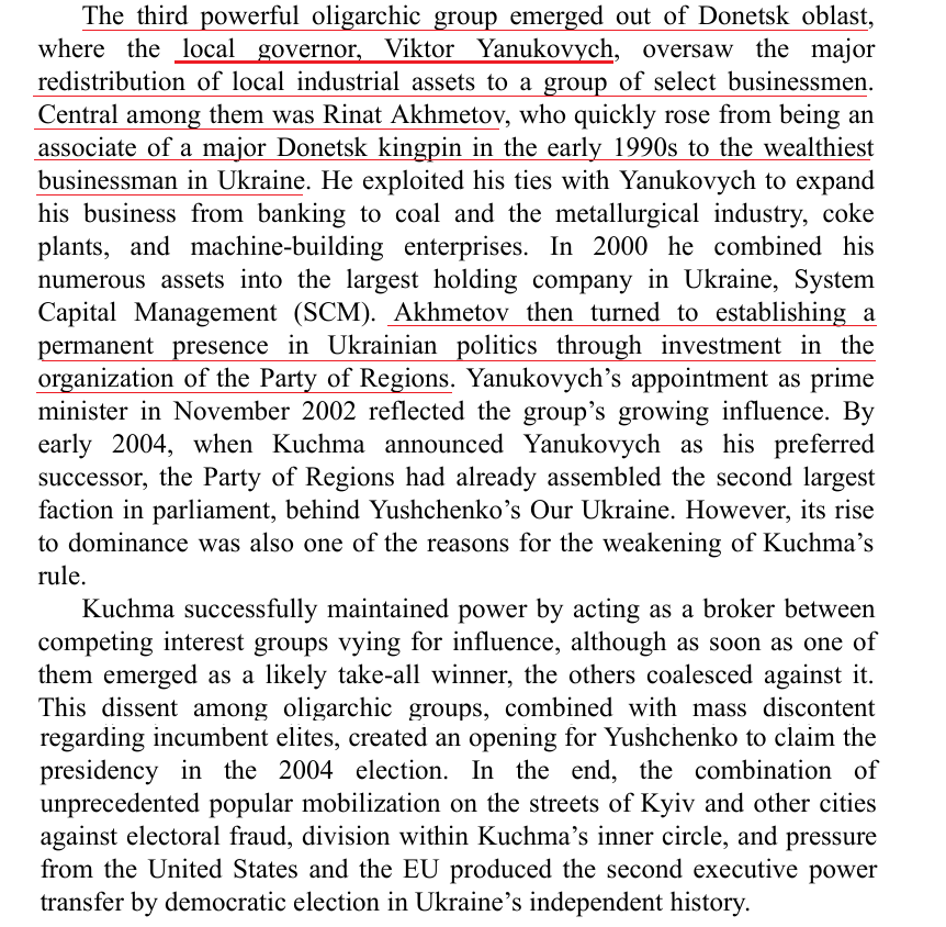 Originally Kuchma's creature, Donbass governor Yanukovych independently grew his own corrupt powerbase, with Tatar mob-affiliate-turned-oligarch Akhmetov as his right-hand man. They founded another Russophone-interest party. This was too much, & in 2004 Kuchma finally lost Pres.