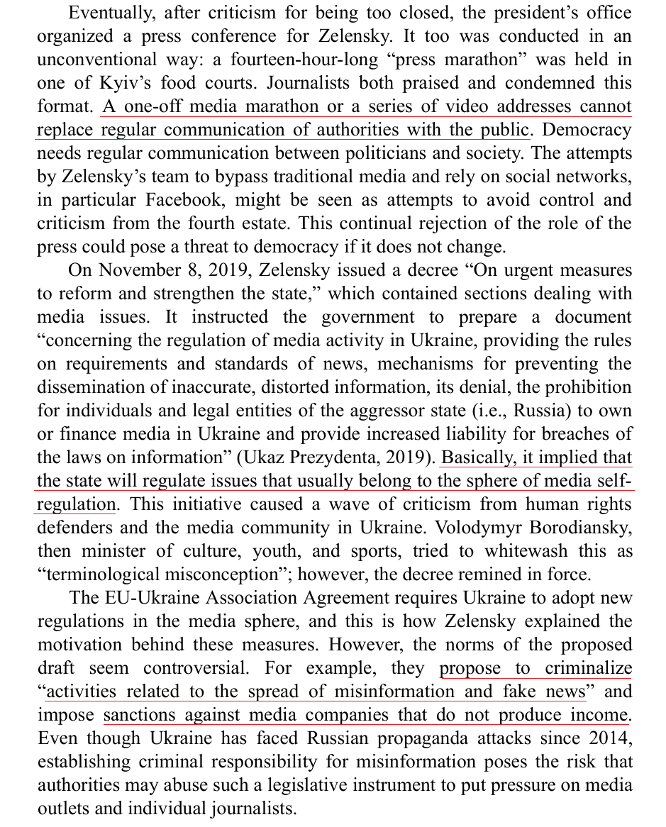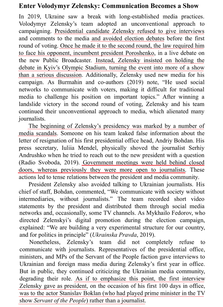 Some interest in📺/🚔 chapters. Zelensky's campaign refused all interviews & debates until legally forced. On election, gov meetings secretly held, which Poroshenko had not done. His 1st interview was with a co-starring actor. "Media marathons" reminiscent of Putin's Valdai.🧵/