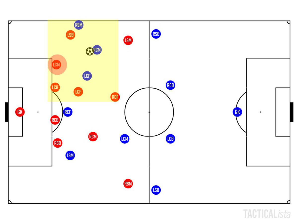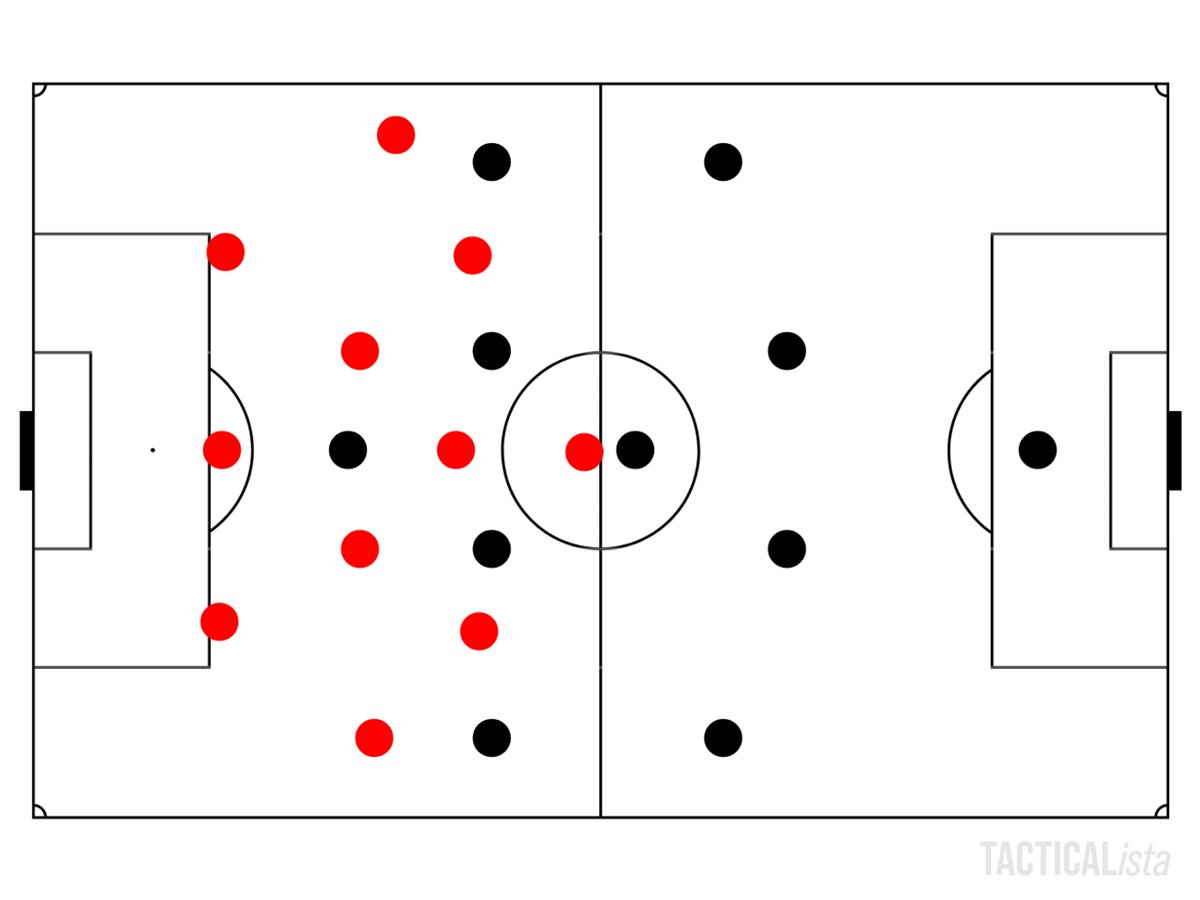 مع الوقت بيولي انتبه للموضوع، الي صار انه عدل تمركز الأطراف للخلف قليلا ولاعب 10 صار يسقط كمهاجم ثاني وباقي الفريق يحتفظ بوضعه الطبيعي